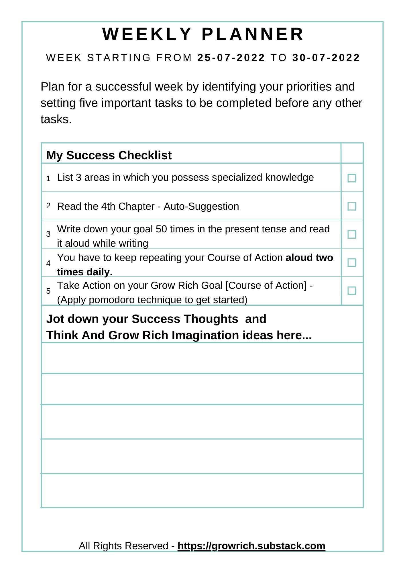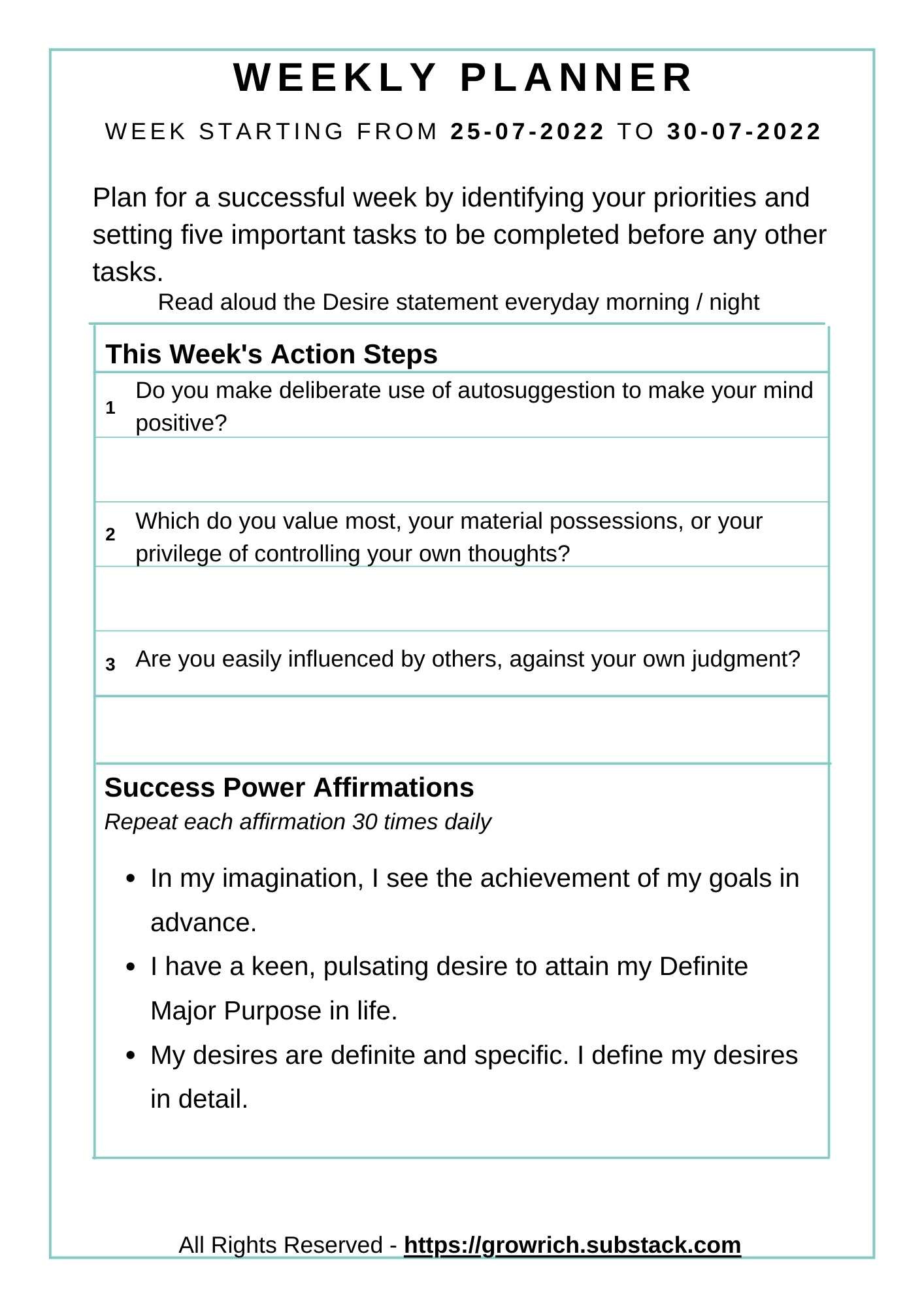 Weekly Planner, Track Your Progress, Checklist And Power Affirmations